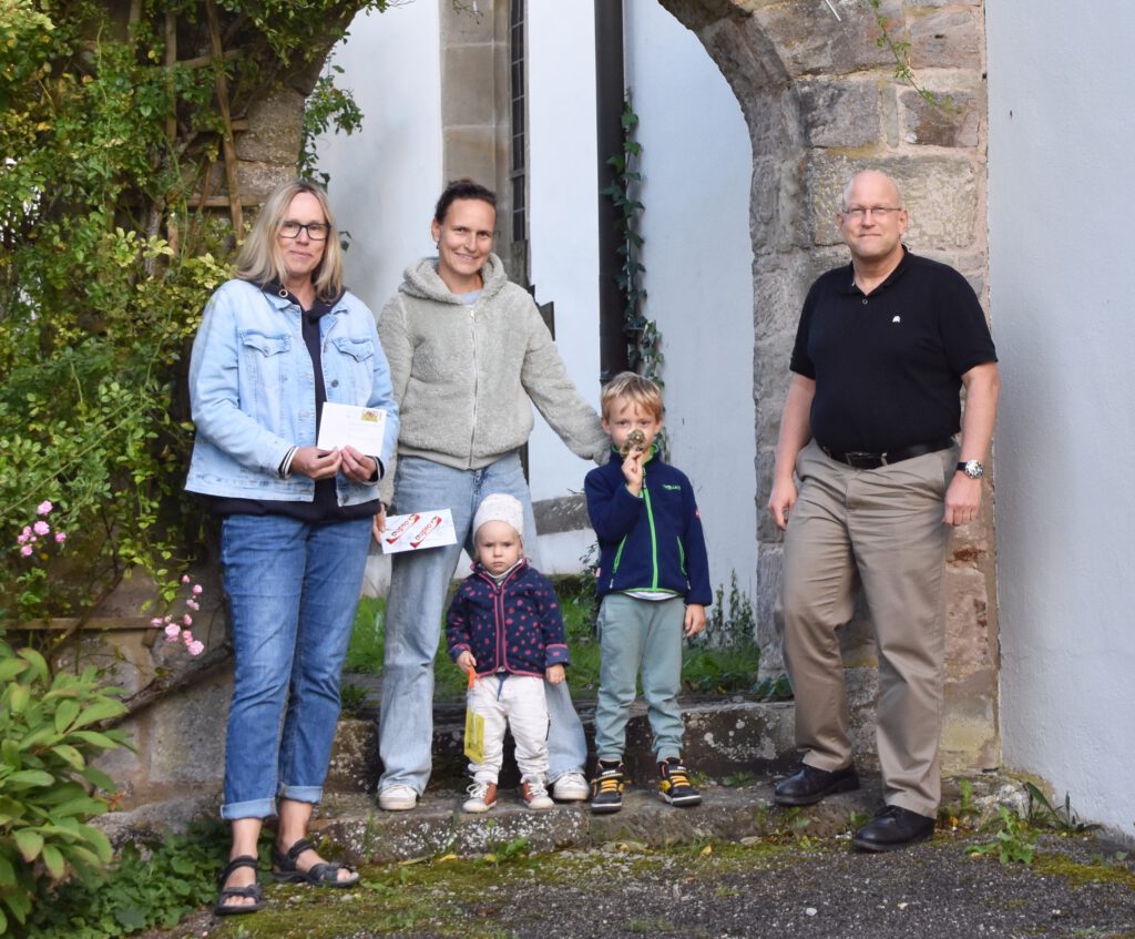 Initiatorin des Luftballonstarts Iris Lang und Pfarrer Henrik Watermann gratulierten der kleinen Stella zu Ihrem Gewinn. Stella und ihre Familie dürfen sich über einen Gutschein für die Eisdiele freuen. Stella und ihr großer Bruder Joshua werden sich bestimmt ein besonders großes Eis aussuchen.